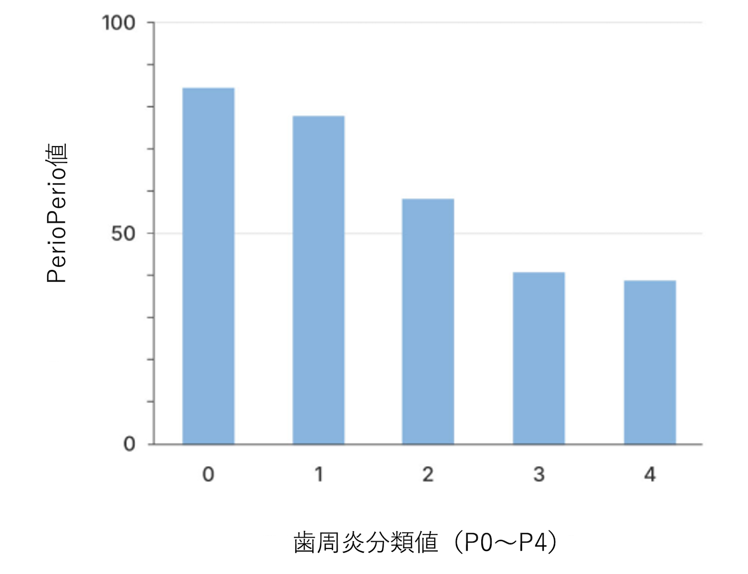 The PerioPerio value is an indicator calculated using the clinical research algorithm SL = -203.9F + 281.2, as presented in the academic paper “PerioPerio: An Academic Paper.” This indicator value has been statistically proven over a five-year clinical study to accurately reflect periodontitis classification (Japanese Dental Association, 2007) without bias. You can use it with confidence.