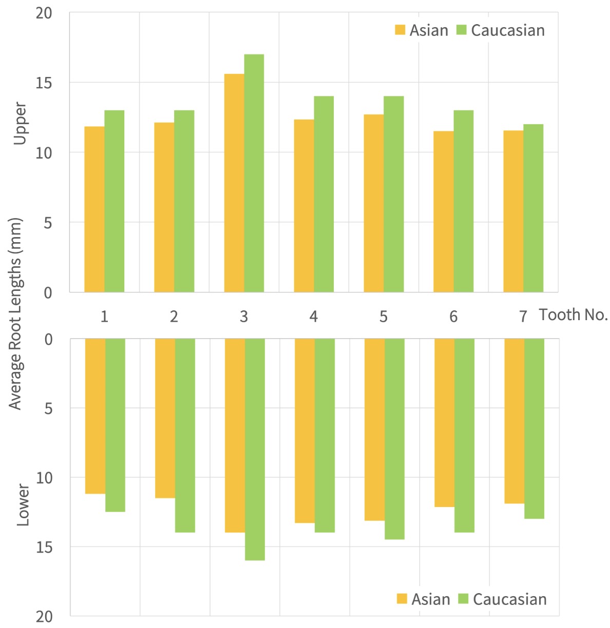 The root length of Asians, including Japanese individuals, is shorter, and depending on the tooth type, the difference can reach up to 2mm.
