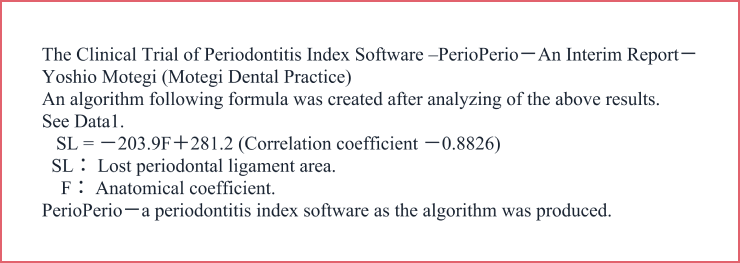 The PerioPerio value is an indicator calculated using the clinical research algorithm SL = -203.9F + 281.2, as presented in the academic paper “PerioPerio: An Academic Paper.” This indicator value has been statistically proven over a five-year clinical study to accurately reflect periodontitis classification (Japanese Dental Association, 2007) without bias. You can use it with confidence.